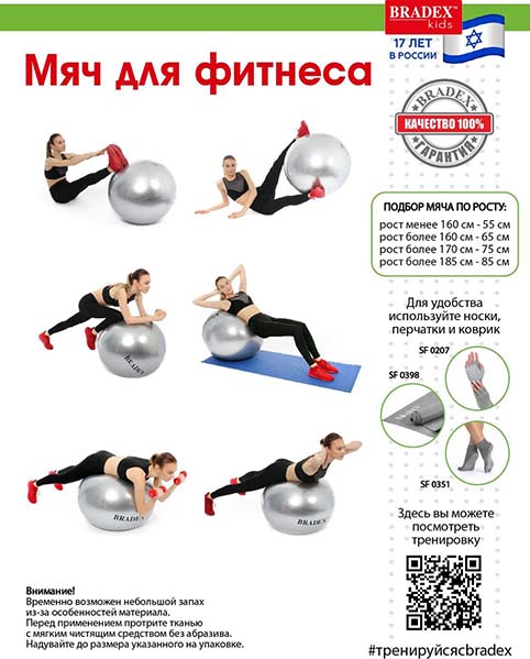 «Фитбол», выдерживающий нагрузку до 120 кг, тренирует пресс, бёдра и ягодицы, развивает силу, гибкость, координацию и корректирует осанку. Даже если Вы просто сидите на нём, то всё равно происходит напряжение разных групп мускул, и единственным условием является сохранение совершенно ровной спины во время выполнения упражнения.