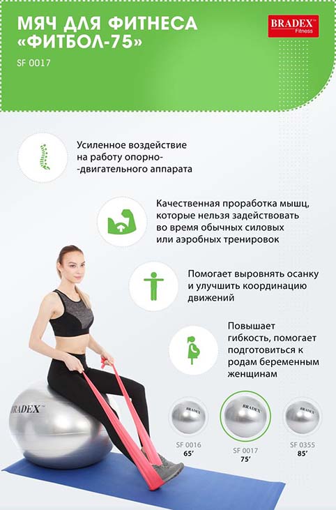 «Фитбол» идеален для занятий аэробикой и во время прохождения реабилитационных комплексов упражнений; он может использоваться даже беременными женщинами, не отказавшимися от физических нагрузок.